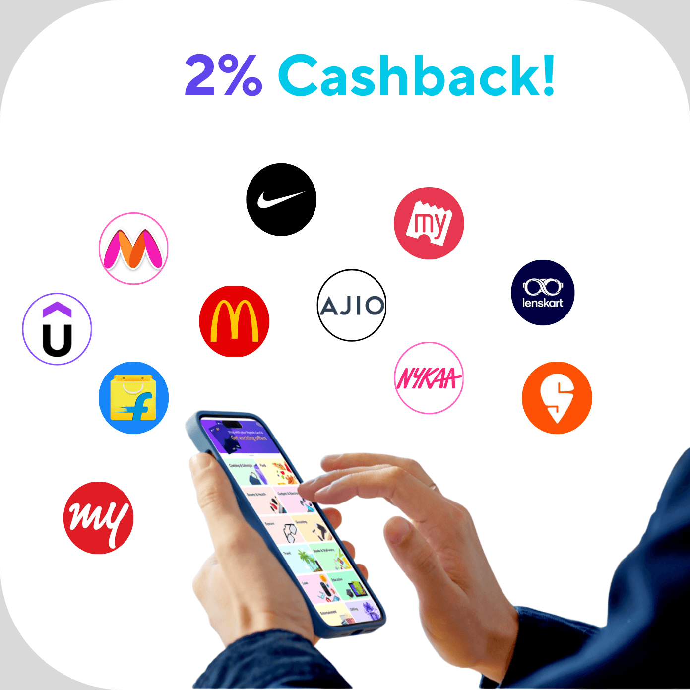 Get flat 2% cashback on 85+ brands like Flipkart, Myntra and more. No confusing codes. No scratching games.